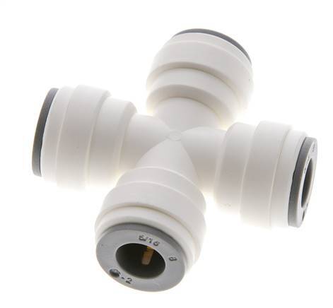 Se trata de un racor de 4 conexiones en cruz. Los racores rápidos son ideales para crear conexiones rápidas y fiables para las mangueras neumáticas. Todas las conexiones tienen un orificio de entrada de 5/16 pulgadas (7,94 mm). El cuerpo está hecho de POM. Los puertos de conexión son de POM. El material de la junta es EPDM. El rango de presión de funcionamiento es de -0,95 a 16 bar (-14 a 232 psi), por lo que es adecuado para los vacíos. El racor es apto para temperaturas de 0 a 65 °C (32 a 149 °F).