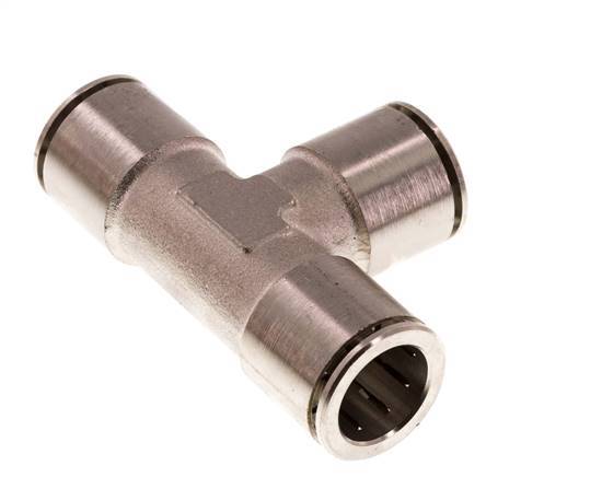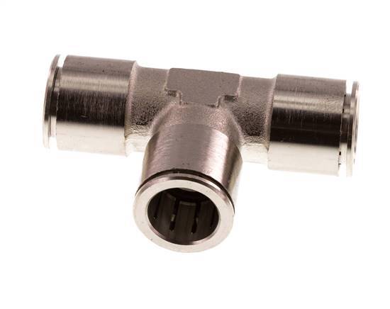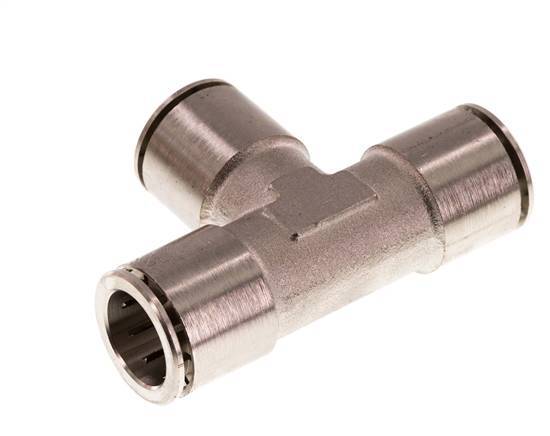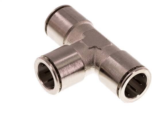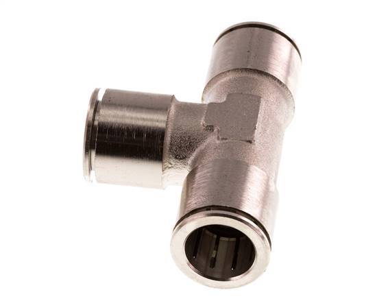 Se trata de un racor en T de 3 conexiones. Los racores rápidos son ideales para crear conexiones rápidas y fiables para las mangueras neumáticas. Todas las conexiones tienen un orificio de entrada de 16 mm. El cuerpo es de latón. Los puertos de conexión son de latón niquelado. El material de la junta es FKM. El rango de presión de funcionamiento es de -0,98 a 16 bar (-14 a 232 psi), por lo que es adecuado para los vacíos. El racor es apto para temperaturas de -20 a 150 °C (-4 a 302 °F). El racor se instala fácilmente empujando el tubo neumático contra el extremo del anillo de liberación del racor hasta que se detenga, y la garra interna lo fija en su sitio. Se desinstala fácilmente empujando el anillo de liberación hacia el interior del accesorio y tirando del tubo hacia atrás.
