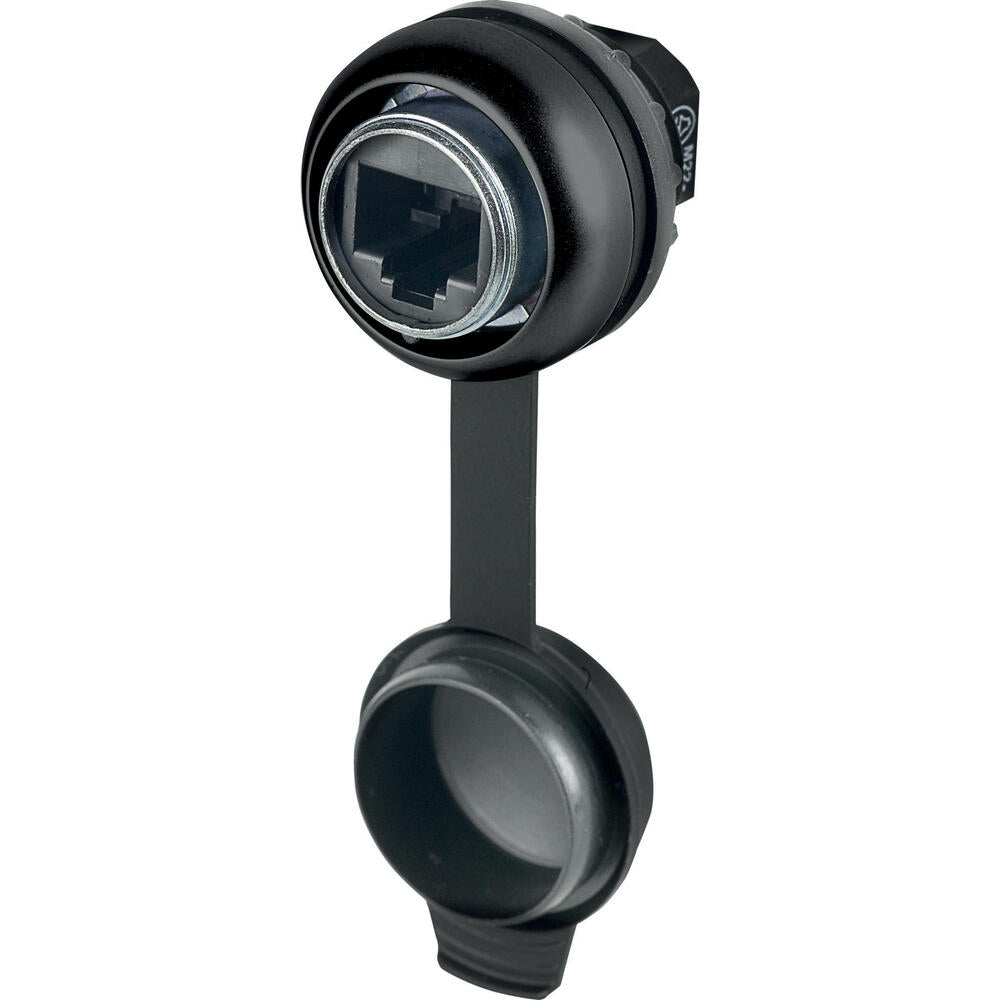 Interfaz de conector RJ45 de 8 pines profesional diseñada para aplicaciones de montaje en panel frontal. Presenta cumplimiento con la categoría 5e y clasificaciones de protección IP duales: IP65 con tapa cerrada e IP20 con enchufe conectado. Incluye acabado de bisel negro para una integración profesional. Adecuado para conexiones RJ45 estándar 8/8 en paneles de control industriales e instalaciones de equipos.