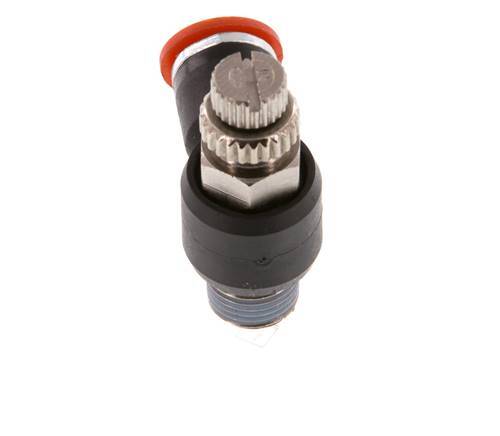 Se trata de un silenciador de control de flujo neumático de latón niquelado/PA 66 en codo para el control ajustable en una dirección del flujo de aire. Tiene un racor de 6 mm en un lado y un puerto de rosca macho de 1/8 pulgadas en el otro. Dispone de juntas de NBR que lo hacen adecuado para aplicaciones en un rango de temperaturas de -20 a 80 °C (-4 a 176 °F). El rango de presión de funcionamiento es de -0,95 a 20 bar (-14 a 290 psi), por lo que es adecuado para los vacíos. Utilice la aguja giratoria para ajustar el tamaño del orificio que define el caudal en una dirección.