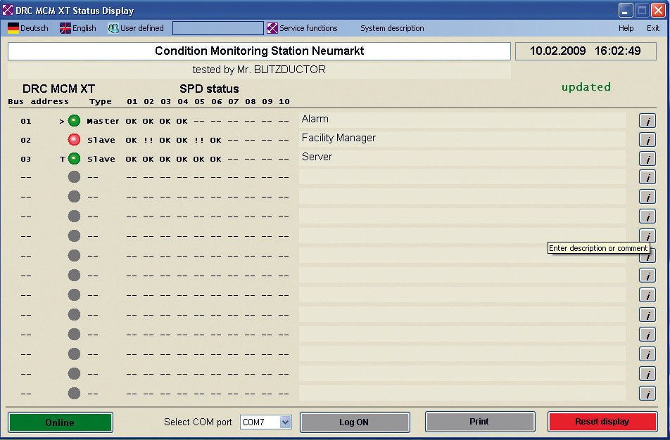 El DEHNrecord de DEHN es un sistema de monitorización de estado montable en carril DIN, equipado con un sensor LifeCheck integrado. Está diseñado para supervisar hasta diez descargadores BLITZDUCTOR XT/XTU dotados de LifeCheck. El estado de funcionamiento se indica visualmente mediante un LED tricolor, complementado por una función de señalización remota, que ofrece un contacto de apertura o cierre. Además, existe la opción de utilizar el software "Status Display and Service Console" a través de un convertidor de interfaz RS485, que proporciona señalización remota basada en PC del estado de todos los descargadores supervisados. El programa puede descargarse en www.dehn.de/download.