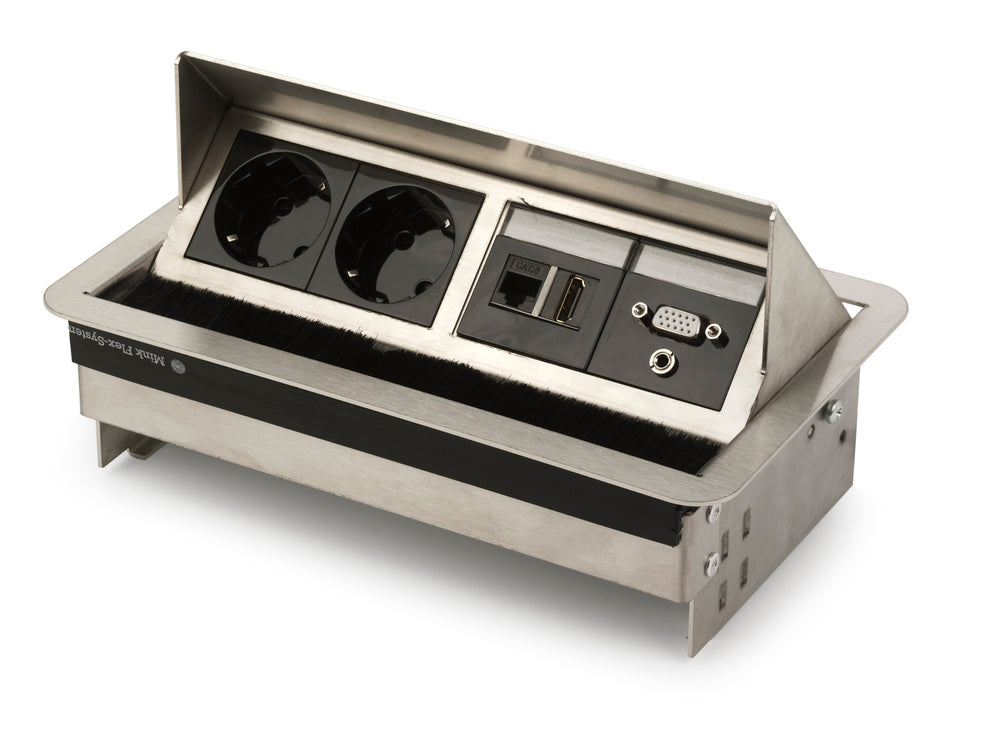 Esta unidad empotrable de sobremesa Rhodes dispone de dos tomas de corriente de 230 V, una conexión UTP CAT6, una conexión HDMI y una conexión VGA/a de acero inoxidable. Las conexiones se realizan fácilmente sin herramientas con cables prefabricados. Cuando el OCS Rhodes no está en uso, la unidad encaja perfectamente en la encimera. Cuando necesites corriente u otra conexión, abre la tapa, enchúfalo a una toma de corriente y vuelve a cerrar la tapa. El cepillo integrado en la unidad empotrada Rhodes evita que los cables se atasquen.