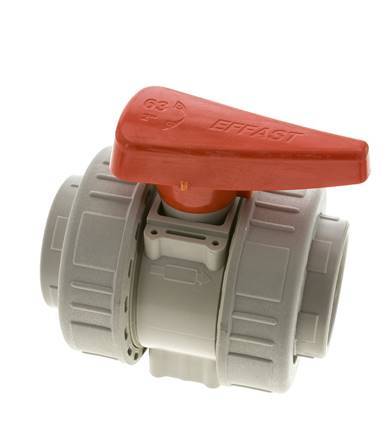 Esta válvula de bola de 2 vías Rp de 2 pulgadas está hecha de PP-H con un sello de EPDM. El diámetro nominal de la válvula es de 50 mm (DN 50). La presión de funcionamiento máxima es de 10 bar (145 psi). La válvula es adecuada para temperaturas de funcionamiento entre 0 y 100 °C (32 a 212 °F). El valor Kv es de 192 m3/h (3200,64 l/min a 1 bar de presión). En unidades imperiales: Cv = 221,95 GPM a 1 psi de presión. Tiene una palanca para el control de apertura/cierre.