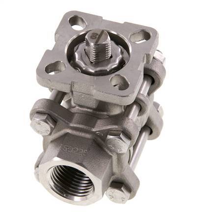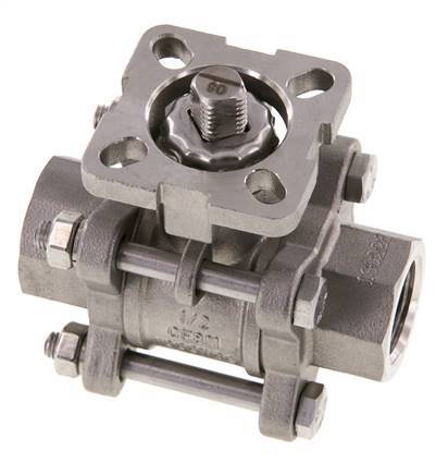 Válvula de bola de 2 vías con roscas G1/2 pulgadas (F/F) e ISO-Top (F03,F04) y diámetro nominal de 15 mm y presión máxima de 63 bar. Gama de temperaturas de -20 a 180°C. Carcasa de acero inoxidable con bola de acero inoxidable y juntas de PTFE/FKM.