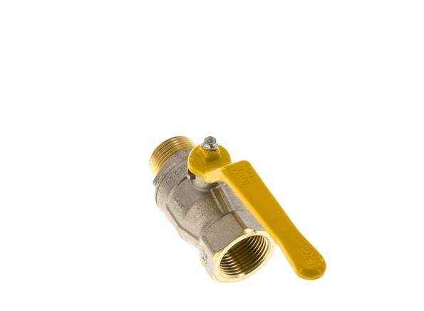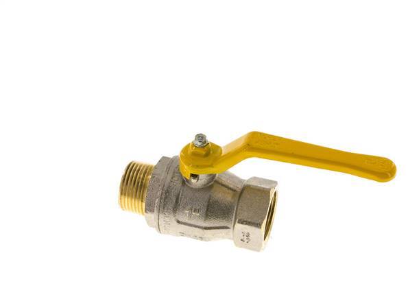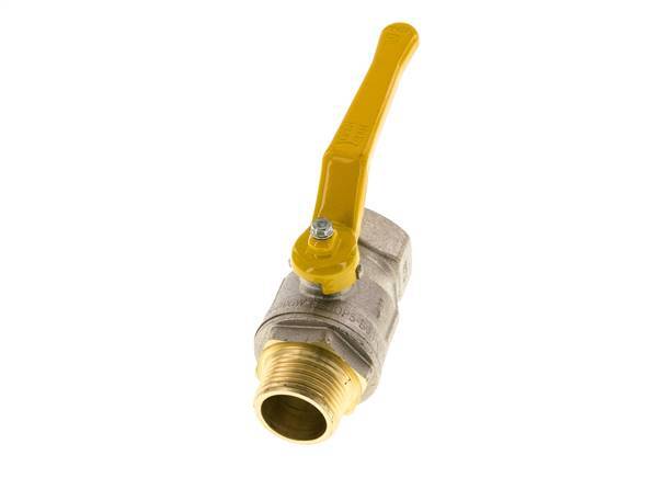 válvula de bola de latón de 2 vías aprobada para gas con puertos macho a hembra R/Rp de 1 pulgada y una manija para controlar el flujo de encendido/apagado. 25 mm de diámetro nominal y una presión máxima de 40 bar (580 psi). La válvula es adecuada para medios líquidos y gaseosos, neutros y gases según la hoja de cálculo DVGW (por ejemplo, gas natural, gas ciudad, gas licuado hasta 5 bar o 72,5 psi). El rango de temperatura es de -20 a 150 °C (-4 a 302 °F) y para el gas de -20 a 60 °C (-4 a 140 °F). Carcasa de latón niquelado, bola de latón y juntas de PTFE/NBR.