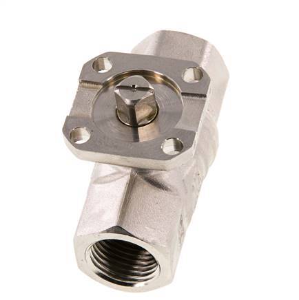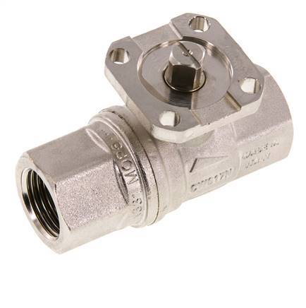 válvula de bola de 2 vías con rosca G1/2 pulgadas (F/F) con ISO-Top (5211 F03), adecuada para el accionamiento con un actuador eléctrico o neumático. Cuerpo de latón niquelado con bola cromada dura y juntas de PTFE/FKM (sin silicona). diámetro nominal de 15 mm y presión máxima de trabajo de 40 bar. Para agua, aceite, aire, gas o vacío. Rango de temperatura de -20 a 160°C. Cumple la norma EN 331 y puede utilizarse para gas natural o gas licuado (máx. 5 bar y 60°C).