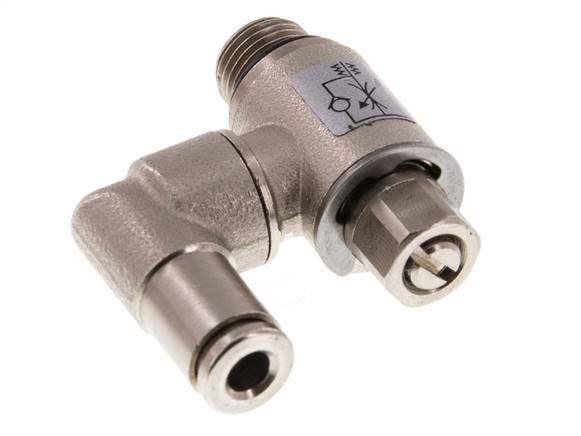 Se trata de una válvula neumática de control de flujo giratoria de latón niquelado para el control ajustable en una dirección del flujo de aire. Tiene un racor de 4 mm en un lado y un puerto roscado macho de 1/8 pulgadas en el otro. Dispone de juntas de NBR/Plástico que lo hacen apto para aplicaciones en un rango de temperaturas de -20 a 80 °C (-4 a 176 °F). El rango de presión de funcionamiento es de 0,2 a 10 bar (3 a 145 psi). Utilice la aguja giratoria para ajustar el tamaño del orificio que define el caudal en una dirección.