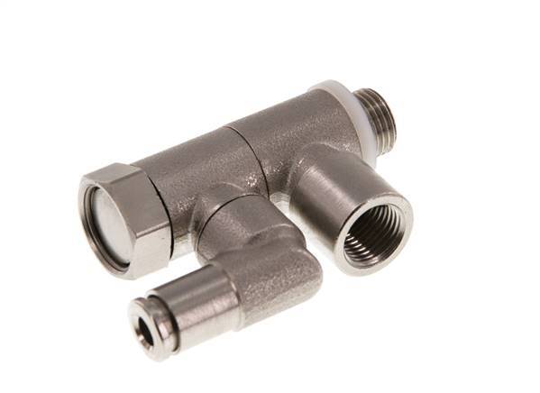 Se trata de una válvula de retención de latón niquelado accionada por piloto. La conexión 1 tiene rosca macho G 1/8 pulgadas y la conexión 2 tiene rosca hembra banjo G 1/8 pulgadas. Tambien tiene una conexión de accionamiento de 4 mm (válvula de retención). La función de válvula de retención puede utilizarse para una breve parada intermedia del actuador. Si hay presión de control en la conexión de 4 mm, el flujo puede viajar en ambas direcciones entre las conexiones 1 y 2. Si no hay presión de control en la conexión de 4 mm, el flujo sólo puede pasar de la conexión 2 a la conexión 1. Dispone de una junta de NBR que lo hace adecuado para aplicaciones en un rango de temperatura de -20 a 80 °C (-4 a 176 °F). El rango de presión de funcionamiento es de -0,5 a 10 bar (-7 a 145 psi). Hay una flecha en el cuerpo del accesorio que indica la dirección del flujo.